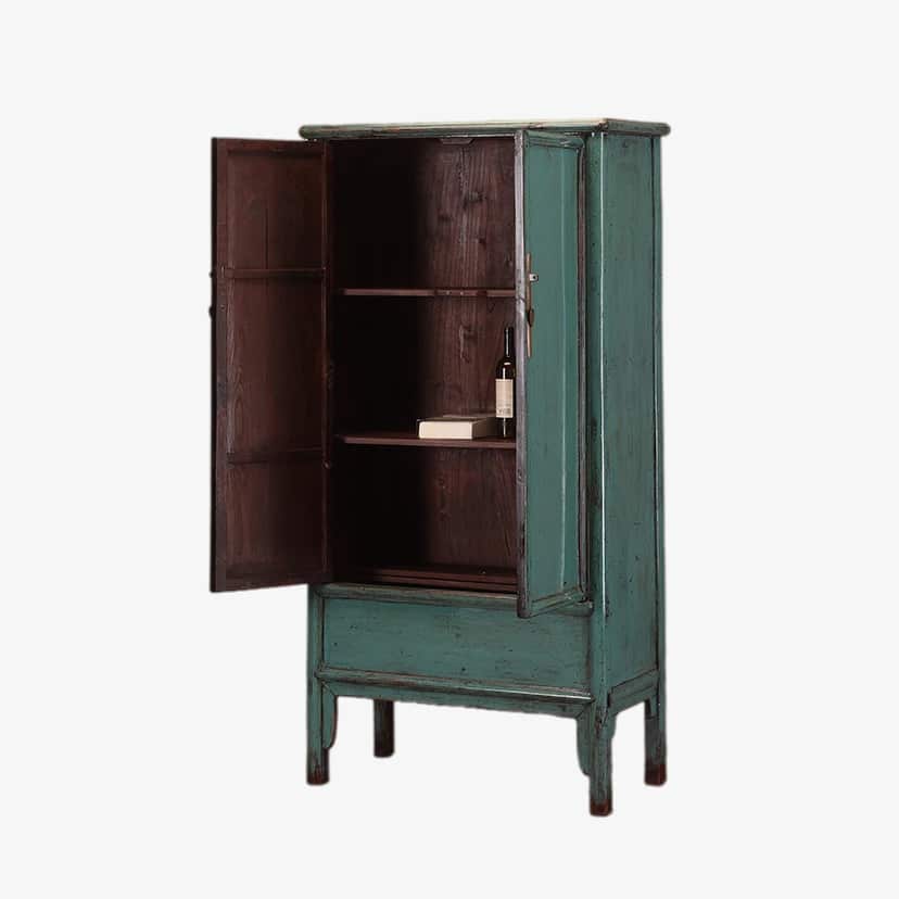 Armoire pagode chinoise laque bleue faite à l’ancienne, province du Shandong. Cette pièce attrayante et élancée est polyvalente pour un salon, une salle à manger ou une chambre. La caractéristique de ce style d’armoire est typique de la dynastie Ming (1368-1644), étroite en haut et large en bas. L’armoire pagode est communément appelée : « cabinet à nouilles ». La conception de l’armoire à nouilles est scientifique et fait bon usage du centre de gravité en physique, étant donné que la façade n’est pas verticale, les portes se ferment naturellement.