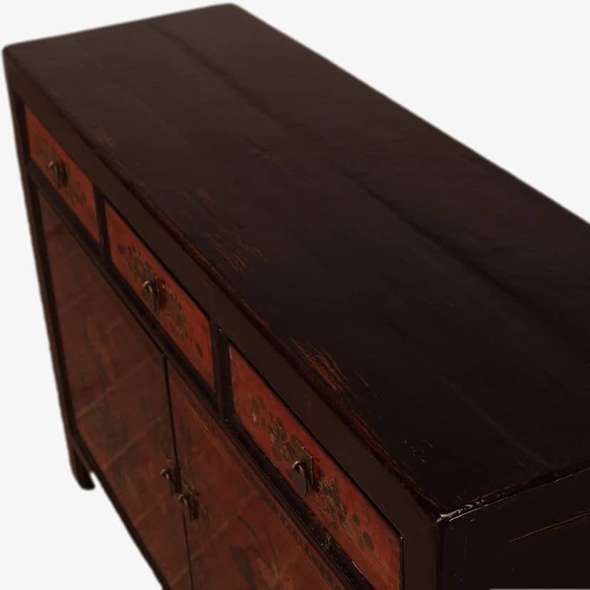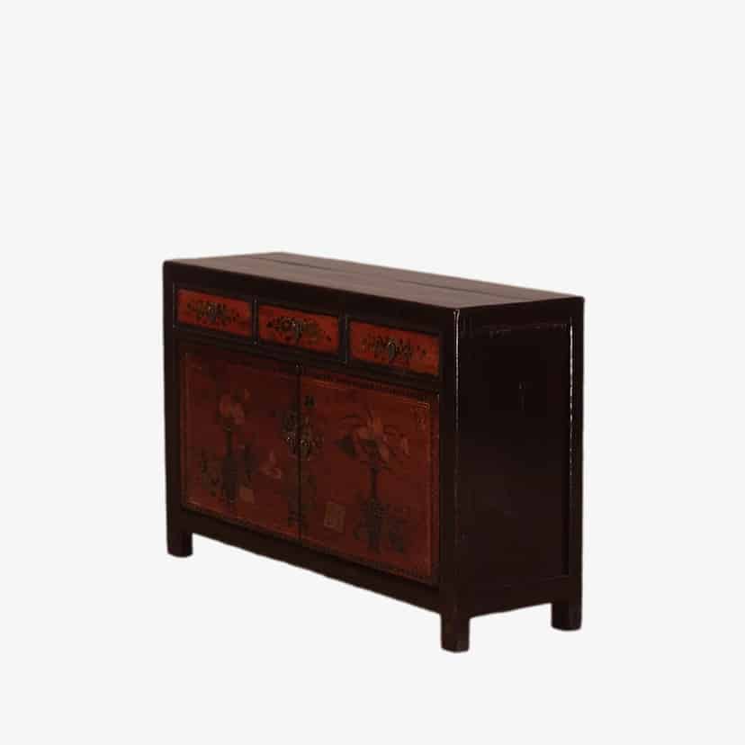 Ce superbe buffet, à la fois laqué et peint artisanalement, met en contraste le noir de l’encadrement avec ses portes décorées de motifs floraux. Ses deux portes sont montées à l’aide de chevilles en bois, chacune s’ouvrant largement pour donner accès à l’espace de rangement où se trouve une étagère amovible.