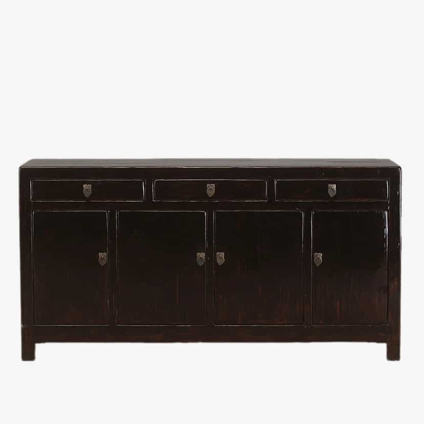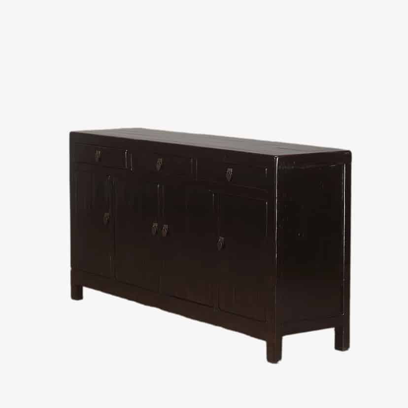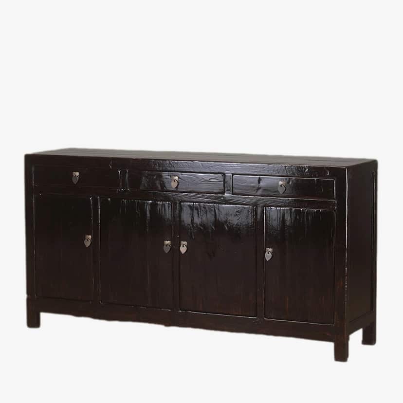 Bahut province du Dongbei noir quatre portes et trois tiroirs. Fabrication artisanale dans le style des buffets de cette province offerts en dot à la mariée. Ses quatre portes sont montées à l’aide de chevilles en bois, chacune s’ouvrant largement pour donner accès à cet espace exceptionnel de rangement. Idéal pour s’intégrer harmonieusement dans un salon, une salle à manger ou une chambre.